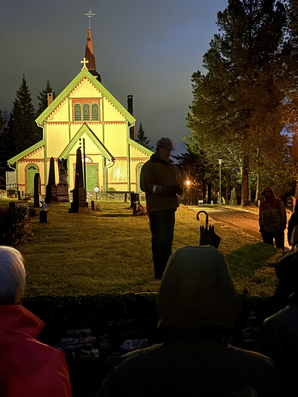 Vi startet på trappa ved kapellet. Her er Per Helge som snakker om at vi er på en gravlund,- ikke en kirkegård. Det kalles gravlund siden det kun er et kapell og ingen kirke